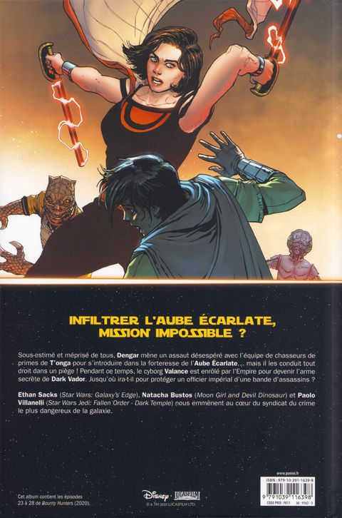 Dengar est sans doute l'un des chasseurs de primes les plus sous-estimés de la galaxie. C'est du moins ce qu'il pense ! Il emmène dans ce tome l'équipe de T'onga dans une mission d'infiltration au coeur du Vermillion, le vaisseau amiral de l'Aube Écarlate... mais il les conduit surtout tout droit dans un piège ! Quant à Beilert Valance, il est devenu le leader d'une escouade aux ordres de Dark Vador. Bounty Hunters est incontestablement l'une des séries préférées des fans ! Comme c'est le cas depuis le tome 1, on retrouve la même équipe artistique avec Ethan Sacks (Galaxy's Edge) et Paolo Villanelli (Jedi Fallen Order - Dark Temple). En plus des chasseurs de primes, on voit dans ce cinquième opus Qi'ra et Dark Vador.