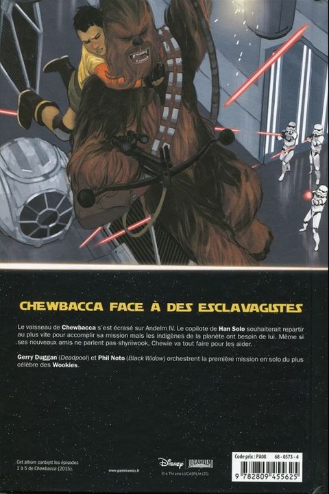 Le copilote du Faucon Millénium dans une aventure solo ! Après la bataille de Yavin, Chewbacca est seul lorsqu'il réalise un atterrissage forcé sur une planète occupée par l'Empire. Il se trouve alors pris au milieu d'une rébellion. 112 pages, 13,00 EUR, en librairie seulement (Contient les épisodes US Chewbacca (2015) 1-5, inédits)