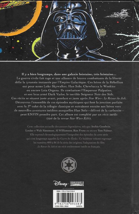 Ces récits se situent juste avant, pendant et juste après Star Wars : Le Retour du Jedi. Découvrez l'ensemble de ces épisodes mythiques qui font la jonction parfaite avec le 3e volet de la trilogie classique et qui entraînent ensuite nos héros vers de nouvelles aventures inédites auxquelles Han Solo - délivré de la carbonite - peut ENFIN prendre part. Cet album est complété par un récit inédit (tiré de la revue Star Wars Kids).