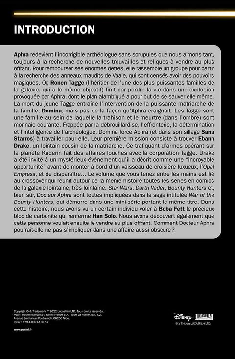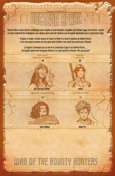Engagées pour une nouvelle mission, le Docteur Aphra et Sana Starros découvrent un étrange vaisseau abandonné. À son bord, elles réveillent une horreur qui était restée terrée depuis des siècles. Elles vont ensuite se retrouver embarquées dans la course pour récupérer le corps de Han Solo ! Nous poursuivons la réédition série par série des épisodes concernés par le crossover War of the Bounty Hunters. Celles et ceux qui préfèrent suivre indépendamment les différentes séries y trouveront ainsi leur compte, car l'événement a été conçu pour satisfaire tous les types de lecteurs !