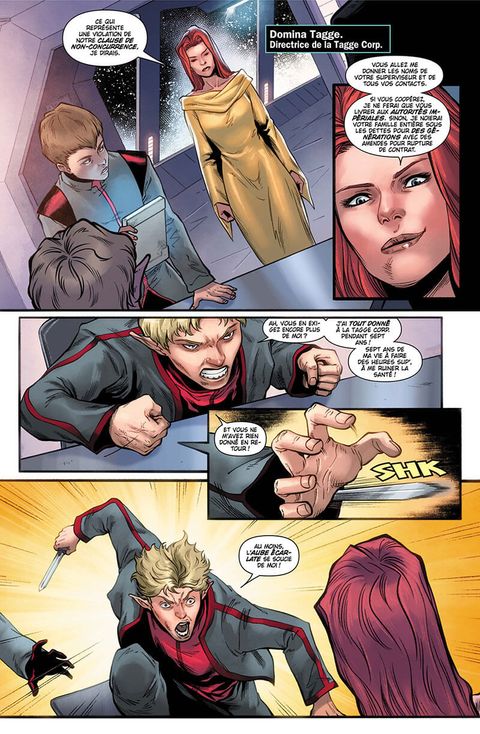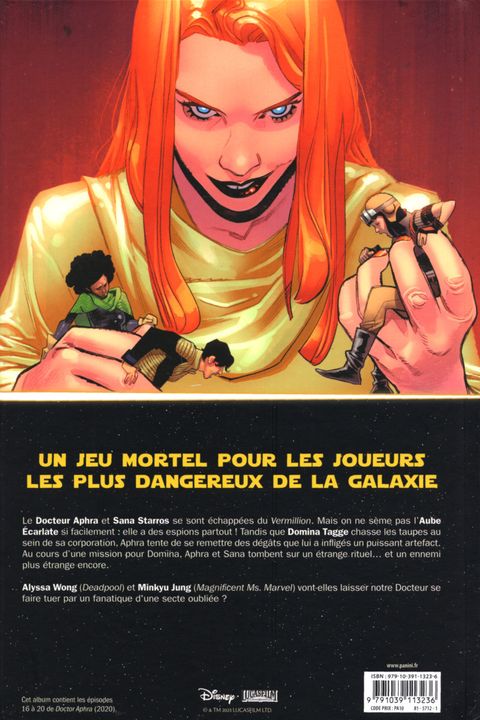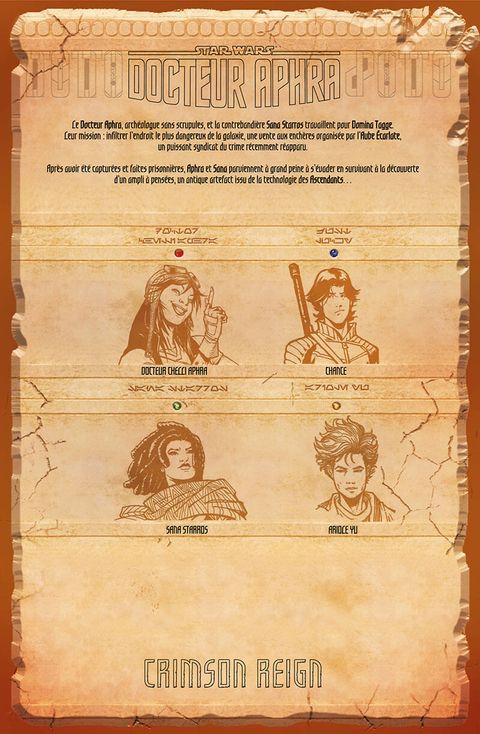 Aphra et Sana ont réussi à s'enfuir du Vermillion mais elles n'échapperont pas à l'Aube Écarlate aussi facilement : le groupe criminel a des espions partout ! La puissante Domina Tagge lance alors les deux femmes à la recherche d'artefacts rarissimes. Une quête qui va les conduire vers une vieille connaissance de Chelli Aphra ! Comme les autres séries Star Wars, Dark Vador et Bounty Hunters, le quatrième tome de Doctor Aphra reprend les épisodes publiés dans les quatre softcovers CRIMSON REIGN. La série poursuit son exploration du passé de la galaxie grâce au travail d'archéologue de la protagoniste.