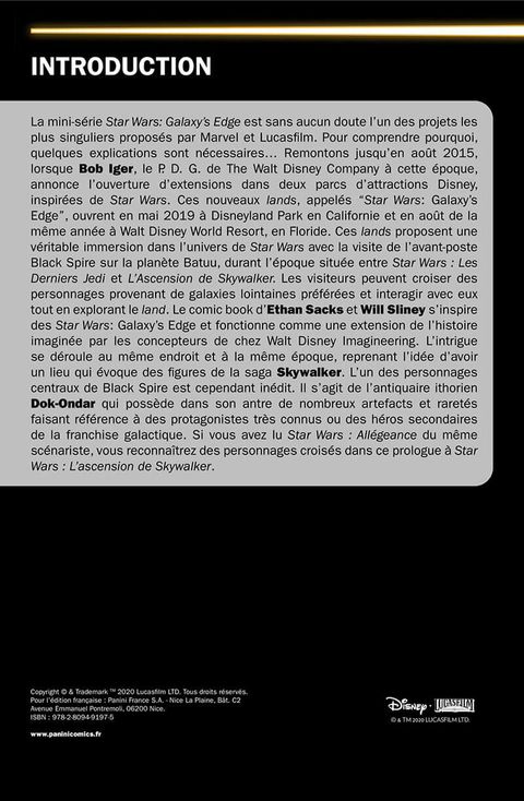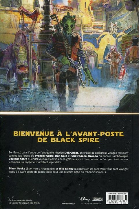 Rendez-vous au bord de la Galaxie sur un marché noir où l'on peut tout trouver : les forces du Premier Ordre, Han Solo et Chewbacca, Greedo ou encore l'archéologue Aphra ! Ce one-shot, basé sur l'attraction Galaxy's Edge des Parcs Disney est aussi en lien avec le roman Black Spire.