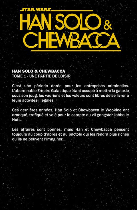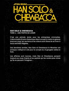Han Solo et Chewbacca font équipe avec Greedo pour accomplir une mission confiée par Jabba le Hutt. Mais la situation dérape quand Solo retrouve la personne la plus inattendue qui pouvait surgir de son passé ! La nouvelle série Han Solo & Chewbacca est publiée en deux tomes. L'histoire se déroule entre le film Solo : A Star Wars story et la trilogie d'origine. On retrouve également dans ce premier volume, le one-shot Life Day inédit et centré sur le vaurien le plus célèbre de la Galaxie.