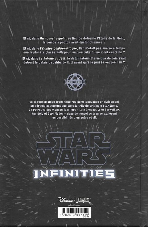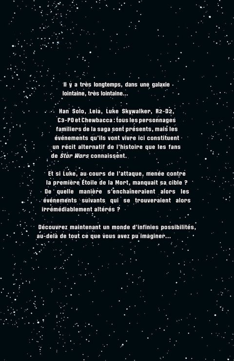 Et si Leia était devenue Dark Vador dans Un nouvel espoir ? Et si Han Solo n'était pas parvenu à secourir Luke des plaines gelées de Hoth dans L'Empire contreattaque ? Et si encore C-3PO était hors-service et de fait incapable d'assurer la traduction de la négociation entre Jabba et Luke pour libérer Han de la carbonite dans Le Retour du Jedi ? Autant de trajectoires variantes qui offrent une merveilleuse nouvelle lecture de la saga des étoiles.