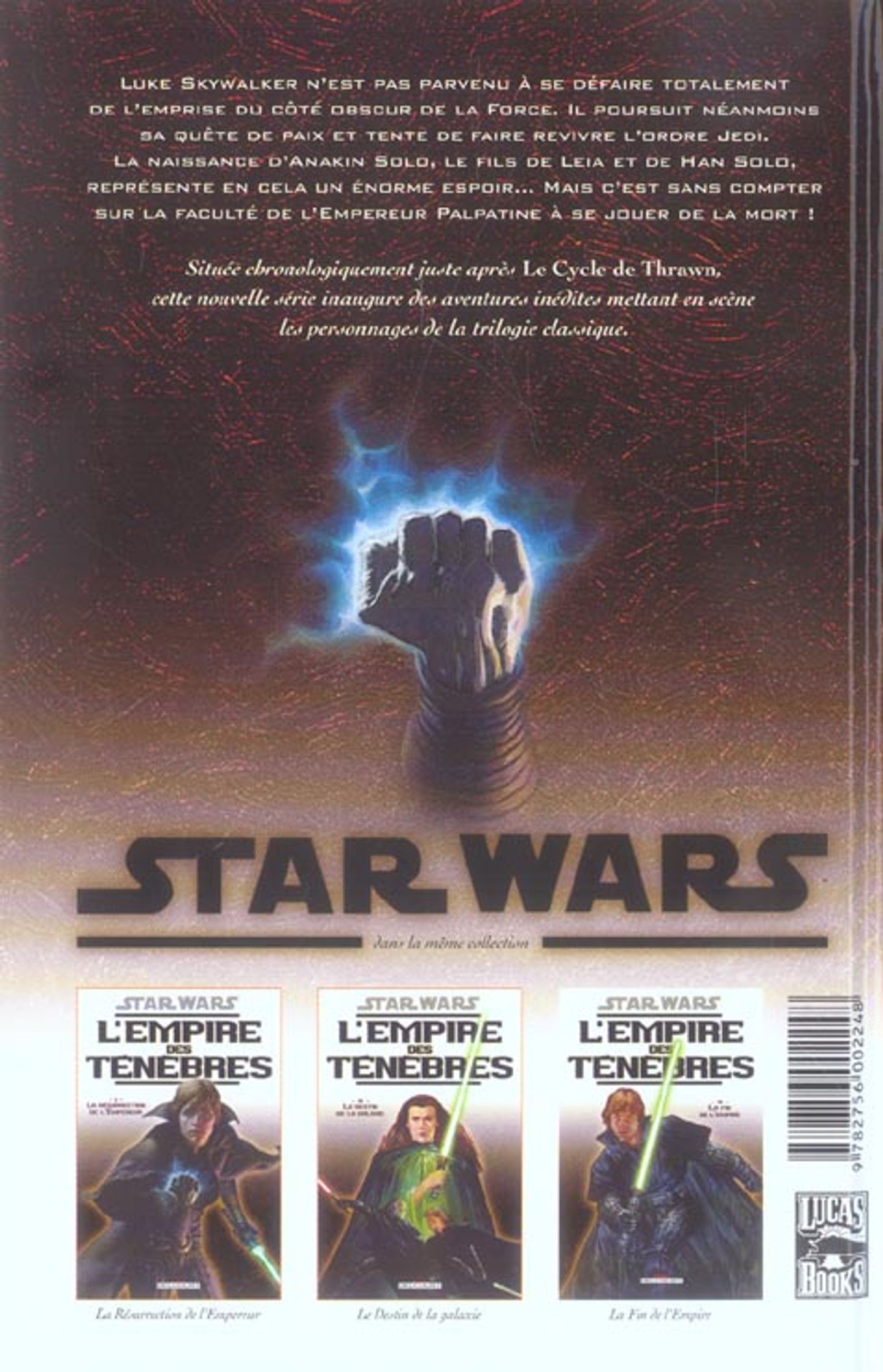 Luke Skywalker n'est pas parvenu à se défaire totalement de l'emprise du coté obscur de la Force ! Il souhaite pourtant poursuivre sa quête de paix et faire revivre l'ordre Jedi. La naissance d'Anakin Solo, fils de Leia et de Han Solo représente en cela un énorme espoir... Mais c'est sans compter sur la faculté de l'Empereur Palpatine à se jouer de la mort !