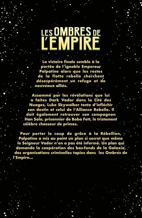 Une première partie très bien avec des arcs narratifs surtout concentré sur Boba Fett et Vador,se qui vient compléter l'arc narratif de Dash Rendar sur le jeux Nintendo 64 du même nom,avec un méchant aussi charismatique que le Prince Xizor. Cependant une deuxième partis assez anecdotiques avec un scénario pas (...) Voir le commentaire