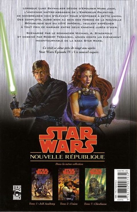 Lorsque Luke Skywalker décide d'épouser Mara Jade, l'ancienne maître-assassin de l'empereur Palpatine, de nombreuses voix s'élèvent pour s'opposer à cette union. Des complots, aussi bien au sein des forces de la nouvelle République que du côté impérial, veulent empêcher à tout prix ce mariage entre deux ennemis jurés d'hier. Scénarisé par le romancier A. Stackpole et dessiné par Robert Teranishi, Union conte un événement incontournable de la saga Star Wars. Ce récit se situe près de vingt ans après Star Wars Episode IV : Un nouvel espoir.