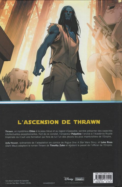 Thrawn, un extraterrestre à la peau bleue et au regard impassible, semble présenter des capacités intellectuelles exceptionnelles. Palpatine l’envoie à l’Académie militaire où il va suivre une formation qui en fera un des atouts les plus imprévisibles de l’Empire. De base je ne m'intéressais pas tellement à ce personnage mais le (...) Voir le commentaire