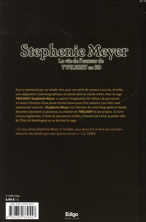 Tout a commencé par un simple rêve, puis une série de romans à succès, et enfin, une adaptation cinématographique acclamée dans le monde entier. Avec la saga Twilight, Stephenie Meyer a captivé l'imagination de millions de personnes à travers l'histoire d'une jeune femme amoureuse d'un vampire. Les rôles sont maintenant inversés : Stephenie Meyer est l'héroïne de cette biographie en bande dessinée racontant sa jeunesse, la création de Twilight et ses projets. Ce livre retrace également, à l'aide de documents inédits, l'histoire de Forks, la petite ville de l'Etat de Washington où se déroule la saga.