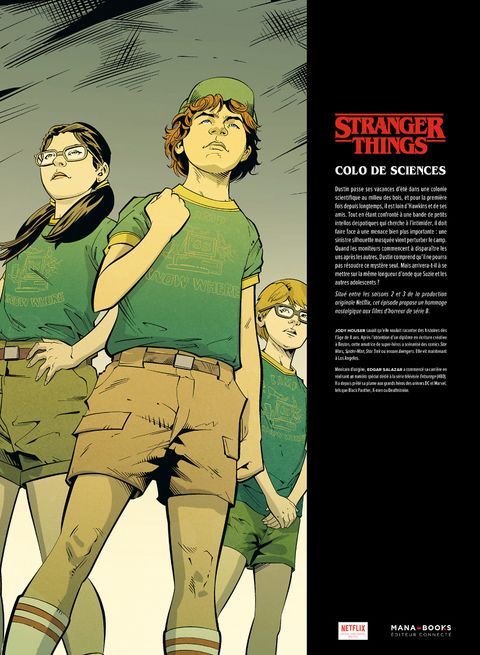 Le phénomène Stranger Things arrive chez Mana Books ! Dustin passe ses vacances d'été dans une colonie scientifique au milieu des bois, et pour la première fois depuis longtemps, il est loin d'Hawkins et de ses amis. Tout en étant confronté à une bande de petits intellos despotiques qui cherche à l'intimider, il doit faire face à une menace bien plus importante : une sinistre silhouette masquée vient perturber le camp. Quand les moniteurs commencent à disparaître les uns après les autres, Dustin comprend qu'il ne pourra pas résoudre ce mystère seul. Mais arrivera-t-il à se mettre sur la même longueur d'onde que Suzie et les autres adolescents ? Situé entre les saisons 2 et 3 de la production originale Netflix, cet épisode propose un hommage nostalgique aux films d'horreur de série B.