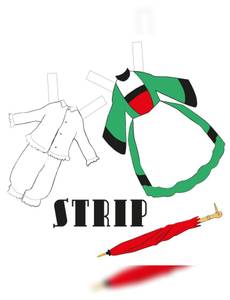 Strip est un livre-programme, presqu’au sens de logiciel, dans le sens où le livre se confond matériellement avec le dispositif qu’il décrit : un strip-tease imaginé autour des jouets en papier, proposé au début du siècle dernier, qui permettait d’habiller des poupées de papier avec divers éléments de costume. Le livret est basé sur une anecdote, avérée ou non, rapportée par le dessinateur français Yves Chaland autour des personnages de Bécassine et de Tintin. Le verso de chaque page montre la silhouette de l’envers du vêtement qui a été retiré au moment de tourner la page, de sorte que le livre fait corps avec le système qu’il décrit. Seul l’objet physique peut restituer l’expérience que ce livre propose. Dans ce strip-tease, jeu qui, à l'origine, relève typiquement du male gaze, la logique s'inverse pour dévoiler un enjeu qui se ne limite, en dernier ressort, qu'au domaine graphique, à travers l'anecdote de Chaland rapportée à la fin. Cette anecdote a la vertu de souligner le caractère collectif de toute création.