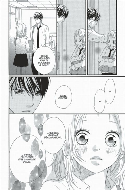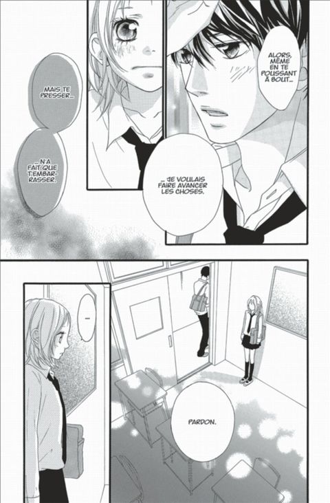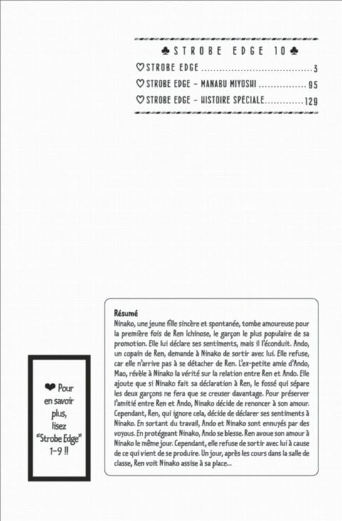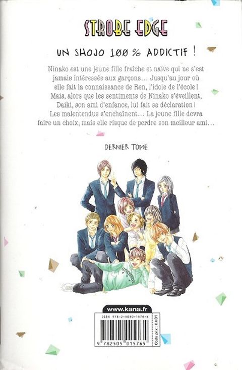 Ninako est amoureuse de Ren. Mais, après avoir vu Ando subir des coups pour la protéger, elle n’a pas le cœur à accepter de sortir avec Ren. Ninako se demande si, au fond, il n’y a pas une autre raison qui motive son refus. C’est à ce moment-là qu’Ando fait une chose inattendue. Quel sentiment Ninako va-t-elle découvrir ? Voici un dernier volume très émouvant et plein d’amour. Il y a également des histoires annexes : une avec Manabu Miyoshi comme personnage principal, et une autre, qui décrit la suite de la relation entre Ren et Ninako.