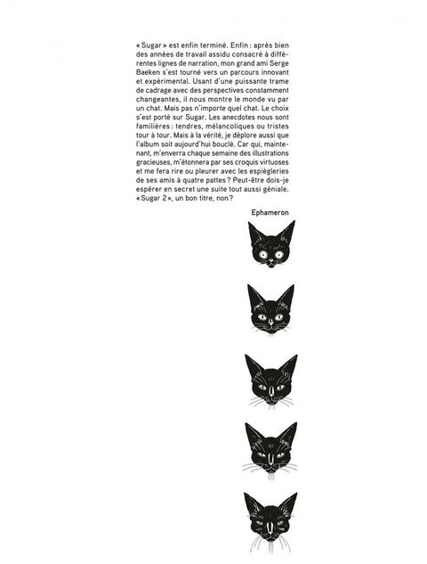 Sugar est la biographie d'un chat noir qui fut pendant 18 ans le compagnon de l'auteur flamand Serge Baeken. En 80 pages, l'auteur va nous raconter la vie à hauteur des yeux d'un chat : marcher, jouer, attraper les mouches, défendre son territoire, déménager, chasser les souris, faire des câlins, se balader avec ses congénères, etc. Tout cela sur fond de vie de famille presque calme. Serge Baeken nous conte ce quotidien de manière chronologique, un spectacle cubique de parfois 24 cases par page, noir et blanc.