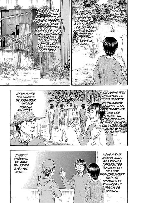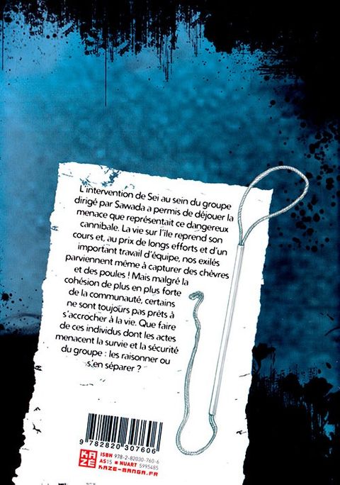 L'intervention de Sei au sein du groupe dirigé par Sawada a permis de déjouer la menace que représentait ce dangereux cannibale. La vie sur l'île reprend son cours et, au prix de longs efforts et d'un important travail d'équipe, nos exilés parviennent même à capturer des chèvres et des poules ! Mais malgré la cohésion de plus en plus forte de la communauté, certains ne sont toujours pas prêts à s’accrocher à la vie. Que faire de ses individus dont les actes menacent la survie et la sécurité du groupe : les raisonner ou s'en séparer ?