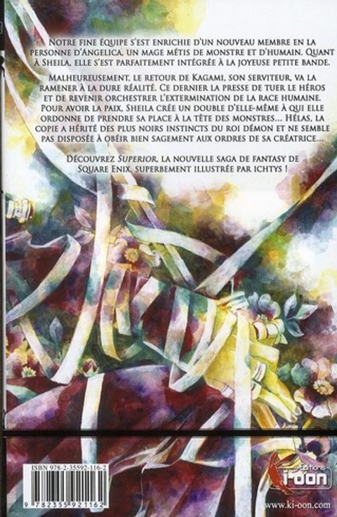 Notre fine équipe s'est enrichie d'un nouveau membre en la personne d'Angelica, un mage métis de monstre et d'humain. Quant à Sheila, elle s'est parfaitement intégrée à la joyeuse petite bande. Malheureusement, le retour de Kagami, son serviteur, va la ramener à la dure réalité. Ce dernier la presse de tuer le héros et de revenir orchestrer l'extermination de la race humaine. Pour avoir la paix, Sheila crée un double d'elle-même à qui elle ordonne de prendre sa place à la tête des monstres... Hélas, la copie a hérité des plus noirs instincts du roi démon et ne semble pas disposée à obéir bien sagement aux ordres de sa créatrice... Découvrez Superior, la nouvelle saga de fantasy de Square Enix, superbement illustrée par Ichtys !