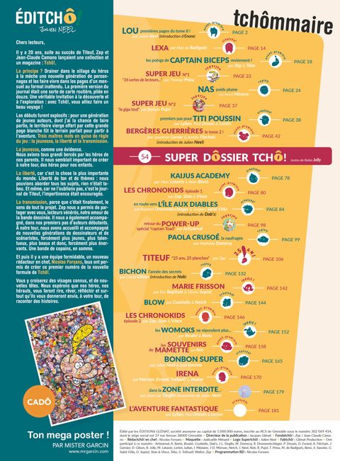 Grandir, avec imagination !Esprit Tchô!. Des héros populaires, de l'humour, de l'aventure, des thématiques fortes portées par une vraie forme d'irrévérence... Depuis 20 ans, la génération « Tchô! » porte en elle des valeurs toujours en mouvement, toujours modernes. Un état d'esprit né en 1998 avec Zep dont Titeuf fut le fer de lance pour faire rire et rêver tant de lecteurs. Le mégazine Tchô! s'est arrêté en 2013 sur un au revoir qu'une nouvelle génération d'auteurs est bien décidée à faire oublier.Dans ce troisième numéro de Supertchô, retrouvez vos personnages favoris mais aussi les héros de demain à travers 150 pages de bande dessinée : de la création, mais aussi de nouvelles séries en prépublication exclusive ! BD, jeux, anecdotes, informations exclusives... Avec Supertchô, « l'esprit Tchô! » renaît, plus vivant que jamais. Peut-être même est-il en train d'entrer dans une nouvelle ère ?