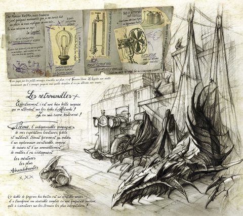 Elian Black'Mor aventurier et rêveur du début du XXe siècle, note et dessine sur les feuilles de son carnet de voyage, le résultat de ses investigations sur la piste des dragons oubliés.