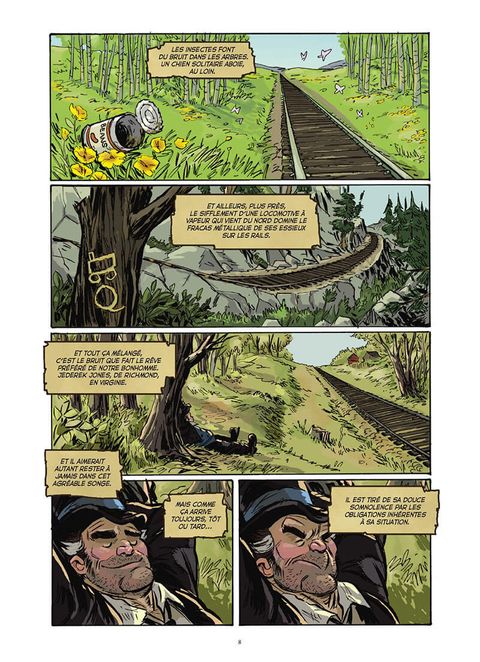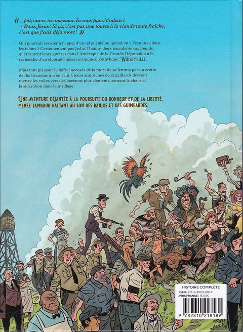 Qui pourrait résister à l'appel d'un tel gueuleton quand on a l'estomac dans les talons ? Certainement pas Jed et Thanny, deux truculents vagabonds qui traînent leurs guêtres dans l'Amérique de la Grande Dépression à la recherche d'un eldorado aussi mythique qu'éthylique : Whiskyville. Mais tant pis pour la bâfre : accusés de la mort de sa femme par un crétin de flic irlandais qui en veut à leurs scalps, nos deux gaillards devront mettre les voiles vers des horizons plus cléments, semant le chaos et la sidération dans leur sillage. Une aventure déjantée à la poursuite du bonheur et de la liberté, menée tambour battant au son des banjos et des guimbardes.