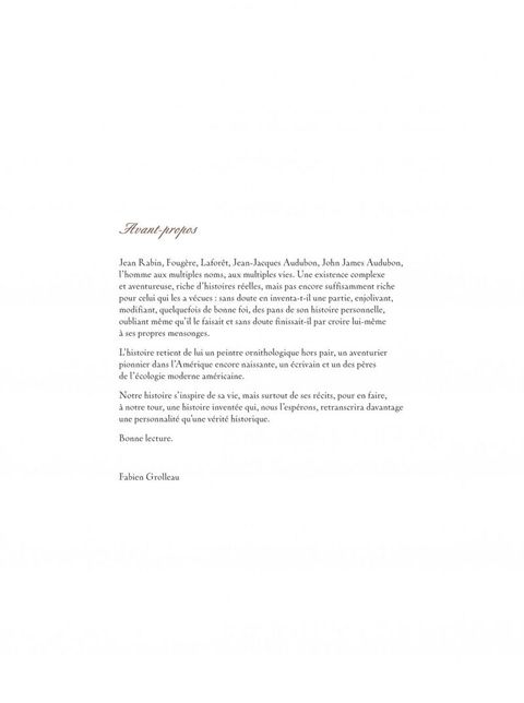 Aventure naturaliste pour l'aventurier naturaliste ornithologue Audubon parti à la découverte des oiseaux d'Amérique du Nord afin de les dessiner en les observant dans leur milieu naturel : une grande première dans le dessin naturaliste. Un voyage tant dans le temps que philosophique nous mettant face à nos actes.