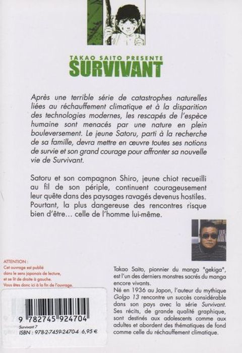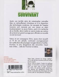 Après une terrible série de catastrophes naturelles liées au réchauffement climatique et à la disparition des technologies modernes, les rescapés de l'espèce humaine sont menacés par une nature en plein bouleversement. Le jeune Satoru, parti à la recherche de sa famille, devra mettre en oeuvre toutes ses notions de survie et son grand courage pour affronter sa nouvelle vie de Survivant. Satoru et son compagnon Shiro, jeune chiot recueilli au fil de son périple, continuent courageusement leur quête dans des paysages ravagés devenus hostiles. Pourtant, la plus dangereuse des rencontres risque bien d'être... celle de l'homme lui-même.