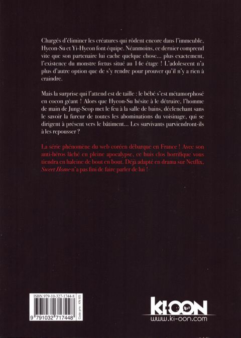 Sans famille, sans amis, sans espoir... un reclus peut-il survivre à l'apocalypse ? Chargés d'éliminer les créatures qui rôdent encore dans l'immeuble, Hyeon-Su et Yi-Hyeon font équipe. Néanmoins, ce dernier comprend vite que son partenaire lui cache quelque chose... plus exactement, l'existence du monstre fœtus situé au 14e étage ! L'adolescent n'a plus d'autre option que de s'y rendre pour prouver qu'il n'y a rien à craindre. Mais la surprise qui l'attend est de taille : le bébé s'est métamorphosé en cocon géant ! Alors que Hyeon-Su hésite à le détruire, l'homme de main de Jung-Seop met le feu à la salle de bains, déclenchant sans le savoir la fureur de toutes les abominations du voisinage, qui se dirigent à présent vers le bâtiment... Les survivants parviendront-ils à les repousser ? La série phénomène du web coréen débarque en France ! Avec son anti- héros lâché en pleine apocalypse, ce huis clos horrifique vous tiendra en haleine de bout en bout. Déjà adapté en drama sur Netflix, Sweet Home n'a pas fini de faire parler de lui !