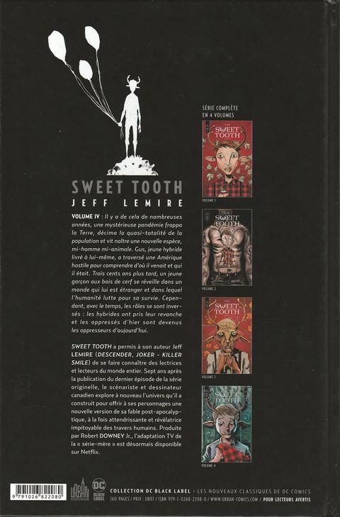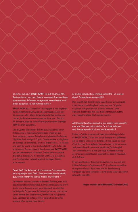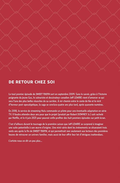 Il y a de cela de nombreuses années, une mystérieuse pandémie frappa la Terre et décima la quasi-totalité de la population. Aux mêmes instants, une nouvelle espèce - mi-homme mi-animale - faisait ses premiers pas. Gus, hybride livré à lui-même depuis la mort de son père, a traversé une Amérique hostile pour comprendre d'où il venait et qui il était. Il a vécu de nombreuses aventures, trouvé des amis fidèles, l'amour aussi, mais surtout la paix intérieure. Des années plus tard, l'histoire se répète. Un jeune garçon aux bois de cerf se réveille dans un monde qui lui est étranger et dans lequel l'humanité lutte pour sa survie. Cependant, avec le temps, les rôles se sont inversés : les hybrides ont pris leur revanche et les oppressés d'hier sont devenus les oppresseurs. Contenu vo : Sweet Tooth – The Return #1-6.
