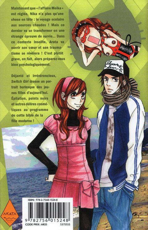 Maintenant que "" l'affaire Melka "" est réglée, Nika n'a plus qu'une chose en tête : le voyage scolaire aux sources chaudes ! Mais ce dernier va se transformer en une étrange épreuve de survie... Dans ce contexte insolite, Arata va ouvrir son coeur et son traumatisme se révèlera ! C'est plutôt grave, en fait, alors préparez-vous bien psychologiquement. Déjanté et irrévérencieux, Switch Girl dresse un portrait burlesque des jeunes filles d'aujourd'hui. Épilation, points noirs et autres délires cosmétiques au programme de cette bible de la fille moderne !