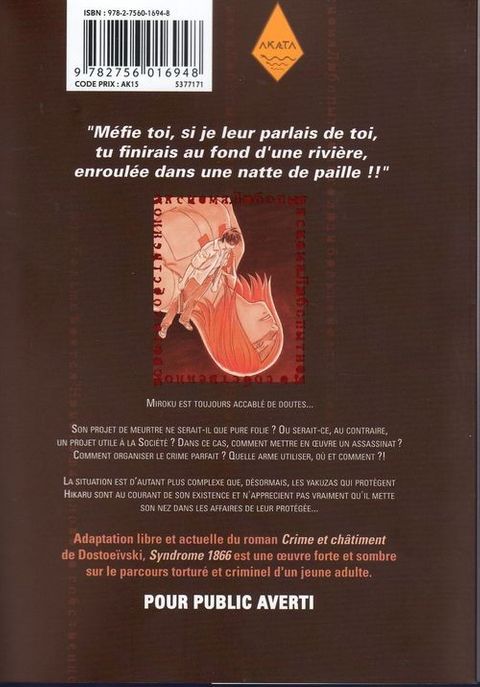 Miroku est toujours accablé de doutes... Son projet de meurtre ne serait-il que pure folie ? ou serait-ce, au contraire, un projet utile à la société ? dans ce cas, comment mettre en oeuvre un assassinat comment organiser le crime parfait ? quelle arme utiliser, où et comment ?! La situation est d'autant plus complexe que, désormais, les Yakuzas qui protègent Hikaru sont au courant de son existence et n'apprécient pas vraiment qu'il mette son nez dans les affaires de leur protégée... Adaptation libre et actuelle du roman crime et châtiment de dostoeïvski, syndrome 1866 est une oeuvre forte et sombre sur le parcours torturé et criminel d'un jeune adulte.