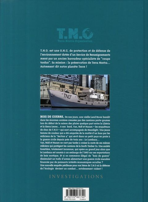 De nos jours, une vieille Land Rover bondit dans les énormes ornières creusées par des camions porte-grumes lors du début de la saison des pluies quelque part entre le Libéria et la Sierra Leone... A son bord, Yan, Rolf et Nuram - les enquêteurs de choc de T.N.O - qui sont accompagnés de Moonlight. Une jeune femme de couleur qui a été amputée de la moitié d'un bras par les miliciens de la ""Section 9"" qui sévit dans un petit pays en proie à la guerre civile depuis près de trois ans : Le Lumbaza... Yan, Rold et Nuram ne vont pas tarder à croiser la route de ces mêmes miliciens qui protègent les camions de la South Tituber Co. Une société forestière, totalement inconnue, qui opère au grand jour alors que le Lumbaza est soumis à un embargo de l'ONU sur ses exportations de bois exotique. Et si ce commerce illégal de ""bois de guerre"" dissimulait un trafic d'armes alimentant une guerre civile macabre financée par de puissants intérêts économiques occultes ? Une nouvelle enquête périlleuse pour nos héros de T.N.O où la défense de l'écologie devient un combat... extrêmement violent !\\0