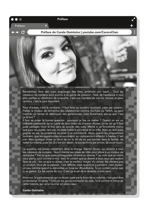 À la manière de Bakuman, qui proposait une plongée dans le milieu de l'édition de manga au Japon, on suit ici le parcours d'Adel, qui veut devenir influenceur pour partager au plus grand nombre sa passion pour les vieilles consoles de jeux vidéo. Son gros problème ? Il est paralysé devant une caméra... Mais sa rencontre, lors d'une convention, avec l'influenceur Benzai va tout changer. Le voilà désormais en lice pour le Talento 7, un concours qui va sacrer le nouvel influenceur vedette du web.
