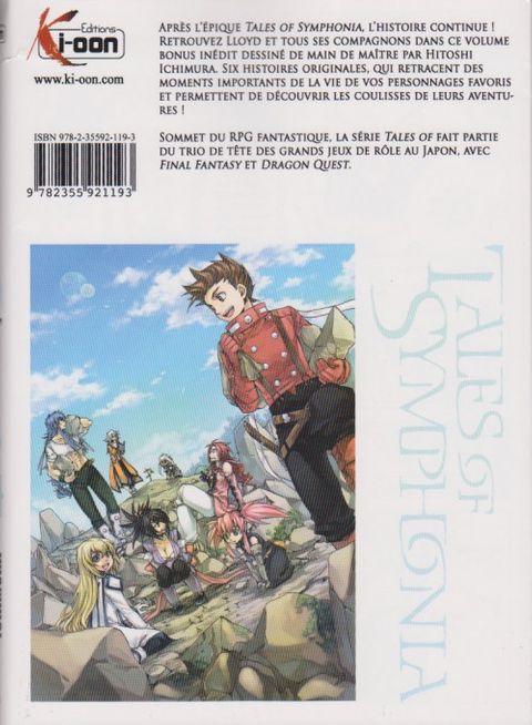 Après l'épique Tales of Symphonia, l'histoire continue ! Retrouvez Lloyd et tous ses compagnons dans ce volume bonus inédit dessiné de main de maître par Hitoshi Ichimura. Six histoires originales, qui retracent des moments importants de la vie de vos personnages favoris et permettent de découvrir les coulisses de leurs aventures ! Sommet du RPG fantastique, la série Tales Of fait partie du trio de tête des grands jeux de rôle au Japon, avec Final Fantasy et Dragon Quest.