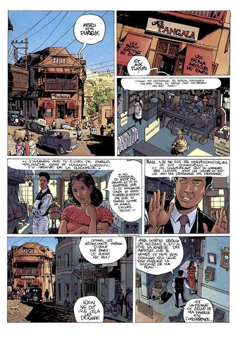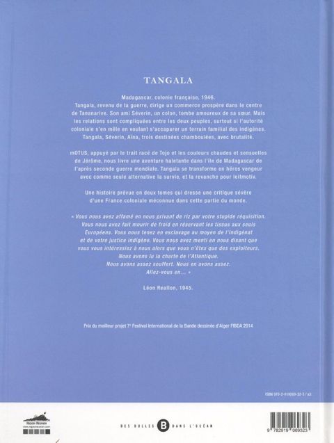 Madagascar 1947. Deux amis, un colon français intégré et respectueux de la société dans laquelle il vit, et un jeune malgache commerçant pro indépendantiste vont se déchirer pour une histoire d'amour. Tangala ne supporte pas que son ami « vahaza » soit épris de sa soeur, faisant ainsi basculer son meilleur ami vers une haine farouche du pays qu'il aime tant. Magistralement mis en scène par Toj, un des auteurs malgaches les plus doués de sa génération, ce récit plein de rebondissements nous entraine en deux tomes à la découverte de l'île rouge encore colonisée par la France, au lendemain de la seconde guerre mondiale. Tous les travers, bons et mauvais de cette société en proie à des contrastes d'intérêts divergents, éclatent sous fond de décors somptueux d'une des plus belles villes du monde : Antananarivo. De la belle, de la grande BD d'aventures doublée d'un intérêt historique évident.