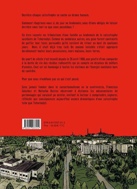 Derrière chaque catastrophe se cache un drame humain. Comment réagirions-nous si, du jour au lendemain, nous étions obligés de laisser derrière nous tout ce que nous possédons ? Ce livre raconte les tribulations d'une famille au lendemain de la catastrophe nucléaire de Tchernobyl. Comme de nombreux autres, ces gens furent contraints de quitter leur foyer, persuadés qu'ils seraient de retour au bout de quelques jours. Mais il était déjà trop tard. Un ennemi invisible s'était approprié durablement toutes leurs possessions, leurs maisons, leurs terres. Un quart de siècle s'est écoulé depuis le 26 avril 1986, une goutte d'eau comparée à la durée de vie des résidus radioactifs qui se compte en dizaines de milliers d'années. Ceci est un hommage à toutes les victimes de l'énergie nucléaire hors de contrôle. Pour que nous n'oublions pas ce qui s'est passé. Sans jamais tomber dans le sensationnalisme ou la controverse, Francisco Sánchez et Natacha Bustos observent à distance les mésaventures de personnages qui auraient pu exister, invitant le lecteur à comprendre, explorer, réfléchir aux conséquences aujourd'hui encore dramatiques d'une catastrophe telle que Tchernobyl.
