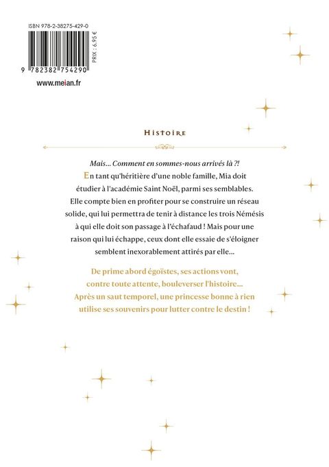 "Mais... Comment en sommes-nous arrivés là ?!"En tant qu'héritière d'une famille noble, Mia doit se rendre à l'académie Saint Noël pour étudier, parmi ses semblables. Elle compte bien en profiter pour se construire un réseau solide, qui lui permettra de tenir à distance ses trois Némésis, à qui elle doit son passage à l'échafaud ! Mais pour une raison qui lui échappe, ceux dont elle essaie de s'éloigner semblent inexorablement attirés par elle...Ses actions, égoïstes au premier abord, vont contre toute attente bouleverser l'histoire...Autrefois bonne à rien, la princesse va lutter contre le destin, et profiter de cette occasion unique pour réparer l'histoire dans cette comédie fantastique !Après un saut temporel, une princesse bonne à rien utilise les souvenirs de sa vie précédente pour se battre contre le destin et changer l'histoire !" C'est la première fois qu'on me traite vraiment avec gentillesse... Comme une fille... "Maintenant qu'elle a échappé à la solitude, Mia danse jusqu'au bout de la nuit ?!