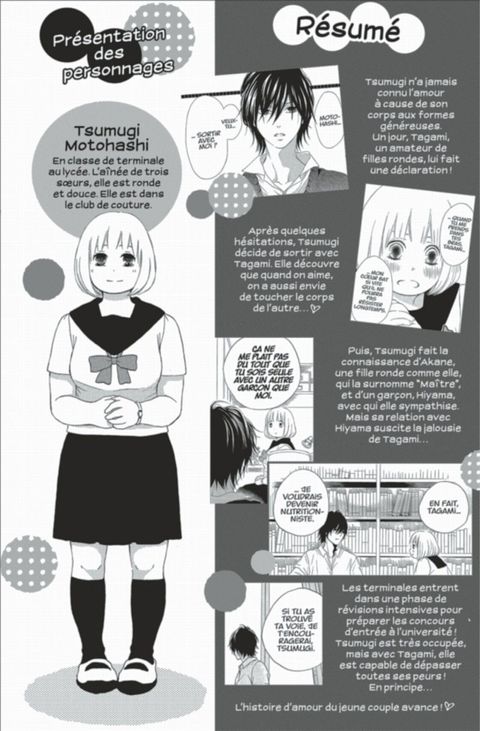 Tsumugi est une adolescente douce et attentionnée. Ce qui la différencie des autres filles, ce sont ses quelques kilos en plus qu'elle porte sans complexe. Elle a subi autrefois quelques brimades... mais au lieu de se laisser abattre, elle a décidé un jour de continuer à s'aimer elle-même quoi qu'en disent les autres. C'est attiré par cet optimisme que Yukiya, un beau garçon, lui demande de devenir sa petite amie.Tsumugi hésite, assez incrédule qu'un garçon s'intéresse sincèrement à elle. Mais cette attirance de Yukiya pour elle va générer de la jalousie chez les autres filles...