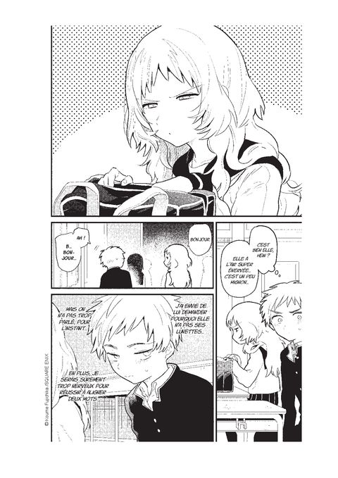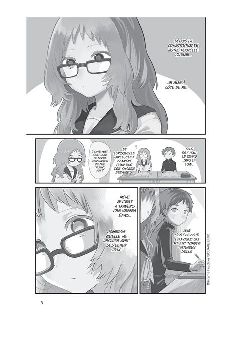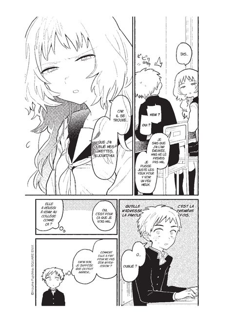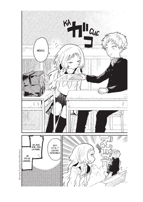 <div style="text-align: justify;">Mie, la voisine de classe de Komura, a oublié ses lunettes. Encore. Déjà troublé rien qu’en la voyant le jeune homme fait de son mieux pour aider sa camarade tête en l’air. Mais, dans un effort désespéré d’y voir plus clair, Mie se retrouve très près de lui… beaucoup trop près ! Komura ne sait plus comment réagir à cette soudaine proximité. Au propre comme au figuré, c’est l’occasion pour lui de se rapprocher !</div>