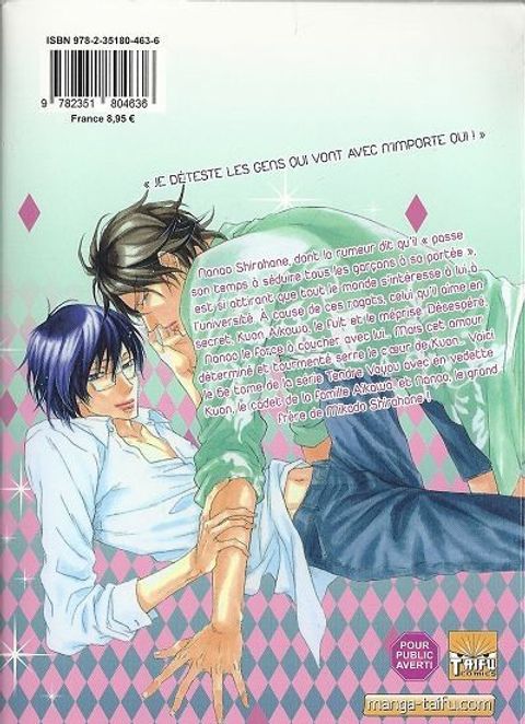 Nanao Shirahane, dont la rumeur dit qu'il "" passe son temps à séduire tous les garçons à sa portée "", est si attirant que tout le monde s'intéresse à lui à l'université. À cause de ces ragots, celui qu'il aime en secret, Kuon Aikawa, le fuit et le méprise. Désespéré, Nanao le force à coulcher avec lui... Mais cet amour déterminé et tourmenté serre le coeur de Kuon... Voici le 6e tome de la série Tendre Voyou avec en vedette Kuon, le cadet de la famille Aikawa, et Nanao, le grand frère de Mikado Shirahane !