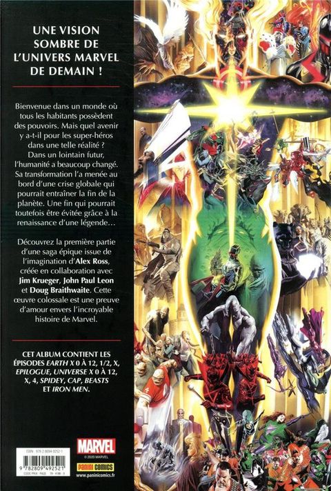 En 1997, l'incroyable peintre Alex Ross (Marvels, Kingdom Come) crée Earth X, une gigantesque saga futuriste décrivant ce que pourrait être l'avenir de l'univers Marvel. Quasiment tous les personnages Marvel y font une apparition, et beaucoup de questions concernant l'arrivée des super-pouvoirs sur la Terre y sont soulevées. Ross, toujours assisté de Jim Krueger, fera de cette épopée une trilogie avec Universe X et Paradise X. La trilogie Earth X / Universe X / Paradise X d'Alex Ross et Jim Krueger est l'une des oeuvres les plus massives et les plus ambitieuses jamais créées dans l'univers Marvel. Ce premier tome gigantesque de plus de 1300 pages regroupe l'intégralité des deux premières sagas ainsi que les épisodes annexes.