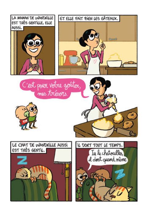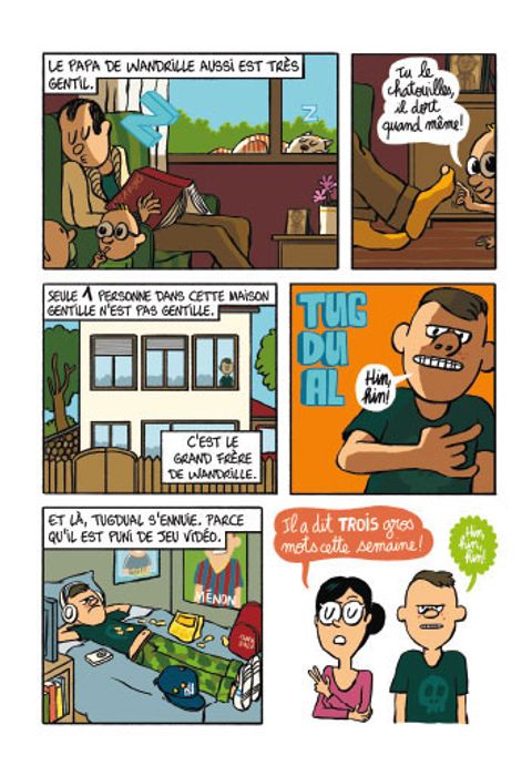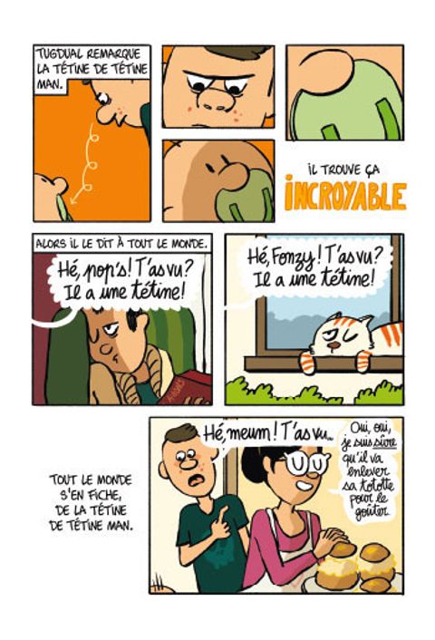 Tétine Man est un enfant qui ne quitte jamais sa tétine : cela lui permet d'être relax et concentré. Et s'il y a des gens que sa tétine dérange, tant pis pour eux. Car celui qui cherche des problèmes à Tétine Man, c'est lui qui a des problèmes. Un jour, Tétine Man va jouer chez Wandrille, un copain à la fois intelligent et gentil. Pendant que sa maman fait des gâteaux, Wandrille lui présente le reste de la famille : le papa et le chat qui roupillent (et qui ne se réveillent pas quand on les chatouille), et le grand frère Tugdual, qui fait rien qu'à leur chercher des noises et à ricaner en se moquant de Tétine Man. Pour être tranquilles pendant qu'ils jouent, Wandrille a une idée. Il se met à compter tout contre le mur de la chambre et Tugdual en déduit qu'une partie de cache-cache est lancée ! Il court se planquer super bien, persuadé que les deux autres vont ramer sévère pour ne jamais le trouver. Il ne se trompe que sur un aspect : les deux autres ne le cherchent pas du tout. Ils jouent dans leur chambre, mangent des gâteaux (personne ne sait comment fait Tétine Man pour manger malgré sa tétine) et passent donc une super bonne après-midi. Et pendant ce temps, Tugdual ricane tout seul dans le vide-ordures stationné devant la maison...