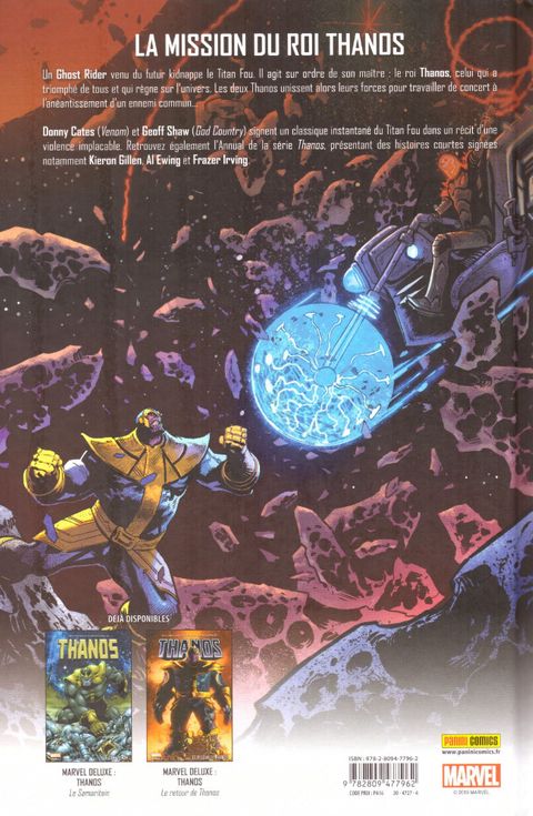 Un Ghost Rider venu du futur kidnappe le Titan Fou. Il agit sur ordre de son maître : le roi Thanos, celui qui a triomphé de tous et qui règne sur l’univers. Les deux Thanos unissent alors leurs forces pour travailler de concert à l’anéantissement d’un ennemi commun... Un one-shot par Donny Cates (Cosmic Ghost Rider) et Geoff Shaw. Contient : Thanos (2017) 13 à 18 et annual 1.