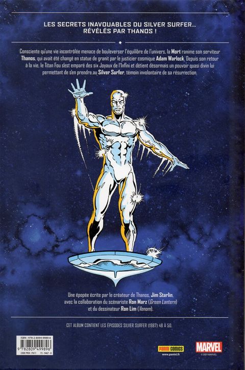 Thanos est toujours à la recherche d'un moyen d'acquérir la puissance nécessaire pour attirer l'attention de sa bien-aimée, la Mort. Le Silver Surfer est seul face à lui, conscient du désastre que pourrait causer le Titan Fou. Pourra-t-il se résoudre à solliciter l'aide de son ancien maître Galactus, le Dévoreur de Mondes ? Le Gant de l'Infini n'était pas le commencement ! Avec ce Graphic Novels et les deux qui l'ont précédé cette année (LA RENAISSANCE DE THANOS et THANOS VS MEPHISTO), vous avez l'occasion de redécouvrir les jalons posés par Jim Starlin et Ron Lim pour préparer la saga qui a inspiré les deux derniers films Avengers. Des épisodes qui avaient uniquement été publiés dans la revue Nova, au début des années 90.