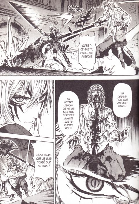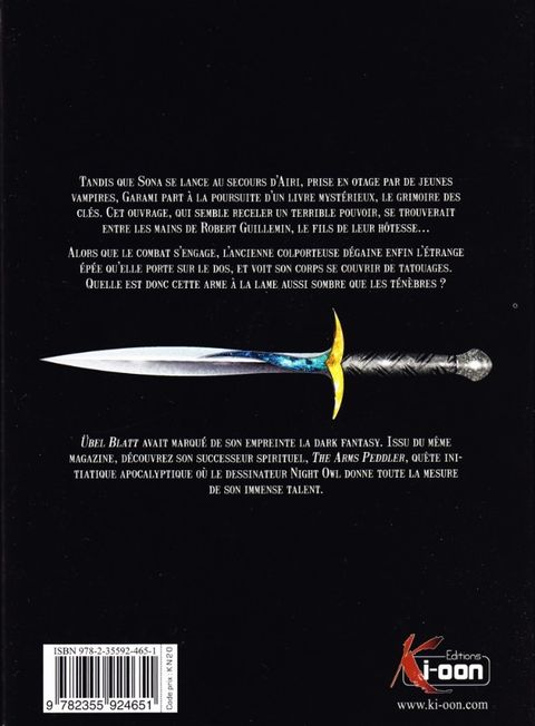 Tandis que Sona se lance au secours d’Airi, prise en otage par de jeunes vampires, Garami part à la poursuite d’un livre mystérieux, le grimoire des clés. Cet ouvrage, qui semble receler un terrible pouvoir, se trouverait entre les mains de Robert Guillemin, le fils de leur hôtesse… Alors que le combat s’engage, l’ancienne colporteuse dégaine enfin l’étrange épée qu’elle porte sur le dos, et voit son corps se couvrir de tatouages. Quelle est donc cette arme à la lame aussi sombre que les ténèbres ?