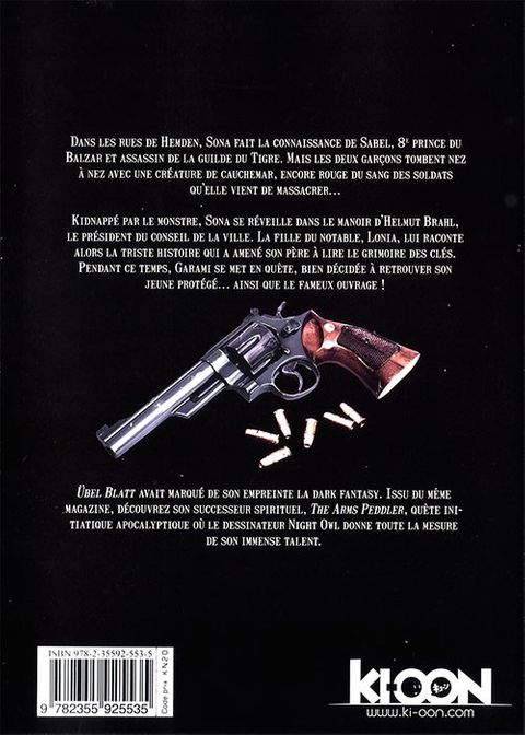 Dans les ruines du manoir Guillemin, Garami détruit le grimoire des clés d'un seul coup d'épée. Tandis que l'ouvrage est consumé par d'étranges flammes ténébreuses, le temps reprend ses droits : la forêt noire disparaît peu à peu avec tous ses occupants ! Airi et ses compagnons peuvent enfin reprendre leur route. Sur le chemin de Caradia, ils tombent sur l'un des approvisionneurs de la guilde, qui décide de se joindre à eux et leur permet de pénétrer dans Hemden. Mais au détour d'une ruelle, Sona se retrouve face au meurtrier de ses parents, le redoutable Hydra. Übel Blatt avait marqué de son empreinte la dark fantasy. Issu du même magazine, découvrez son successeur spirituel, The Arms Peddler, quête initiatique apocalyptique où le dessinateur Night Owl donne toute la mesure de son immense talent.