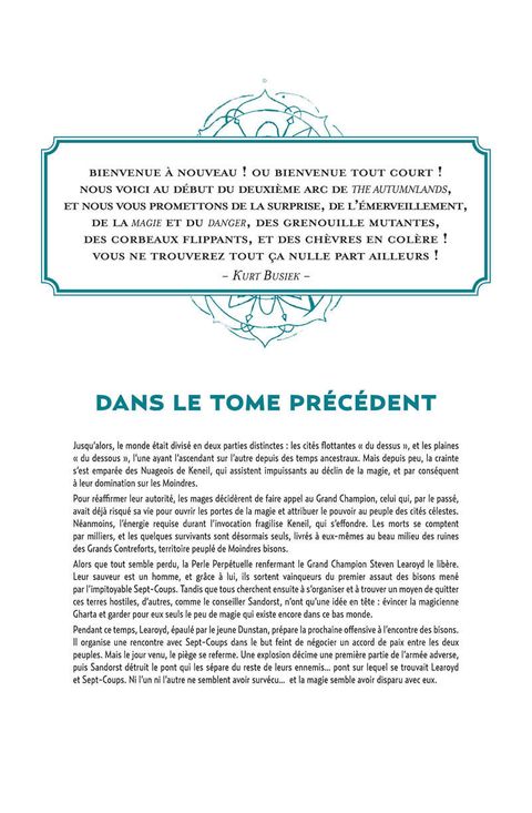 Jusqu'au jour de leur chute, les Nuageois régnaient sur le peuple des Moindres comme si rien ni personne ne pouvait les atteindre. Par trop d'avidité, les voilà désormais dépourvus de magie et livrés à eux-mêmes, en plein coeur des territoires hostiles qu'ils méprisaient autrefois. Alliances et trahisons se succèdent pour accéder au pouvoir et espérer sauver la communauté des survivants. Mais comment feront-ils sans leur Grand Champion, mis hors-jeu par le terrible conseiller Sandorst ? Contient : The Autumnlands #7-13