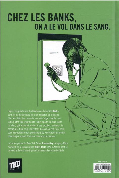 Les femmes de la famille Banks sont les braqueuses les plus talentueuses de Chicago. Quand l'occasion de venger un être aimé leur est offerte, elles prennent tous les risques dans un casse gigantesque, pour que justice soit faite. Nouvelle plongée dans l'univers TKO Comics qui revisite tous les genres avec une maîtrise sans pareille. C'est cette fois le film de casse qui sert d'inspiration à cette saga complète résolument féministe, scénarisée par Roxane Gay, autrice, éditorialiste au New-York Times et essayiste, également lauréate d'un Eisner Award pour la série Marvel World of Wakanda (meilleure mini-série).