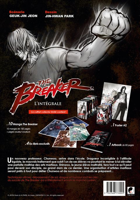 Edition limitée à 1000 exemplaires. Un nouveau professeur, Chunwoo, arrive dans l'école. Dragueur incorrigible à l'attitude égoïste, le mauvais traitement que subit l'un de ses élèves va pourtant le mener à lui dévoiler une parfaite maîtrise des arts martiaux. Shinwoo, le jeune élève maltraité, fera tout ce qu'il peut pour devenir son disciple, au grand dam de ce dernier. Une organisation d'artistes martiaux seront prêts à tout pour défier Chunwoo et de nombreux combats se préparent... Ce coffret collector contient : - Les 10 Manga. - 1 Poster. - 4 Artworks. - 1 Artbook de 70 pages.