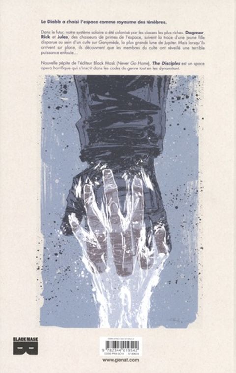 Le diable a fait de l'espace son royaume des ténèbres. Dans le futur, notre système solaire a été colonisé par les classes les plus riches. Dagmar, Rick et Jules, des chasseurs de primes de l'espace, suivent la trace d'une jeune fille disparue au sein d'un culte sur Ganymede, la plus grande lune de Jupiter. Mais lorsqu'ils arrivent sur place, ils découvrent que les membres du culte ont réveillé une terrible puissance enfouie... Nouvelle pépite de l'éditeur Black Mask (Never Go Home), The Disciples est un space opera horrifique qui s'inscrit dans les codes du genre tout en les dynamitant. Quand la terreur sourde de Alien rejoint l'horreur métaphysique de Prince des ténèbres !