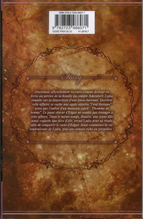 Désormais officiellement recrutée comme docteur en féerie au service de la famille du comte Ashenbert, Lydia enquête sur la disparition d’une jeune baronne. Derrière cette affaire, se cache une agate appelée “l’œuf féerique” ainsi que l’ombre d’un mauvais esprit : “l’homme de brume”. Le passé obscur d’Edgar ne semble pas étranger à cette affaire. Dans le même temps, Rosalie, une jeune fille aussi coquette que fière d’elle, prend Lydia pour sa rivale afin de conquérir le cœur d’Edgar. Ainsi commence la vie londonienne de Lydia, plus que jamais riche en péripéties !