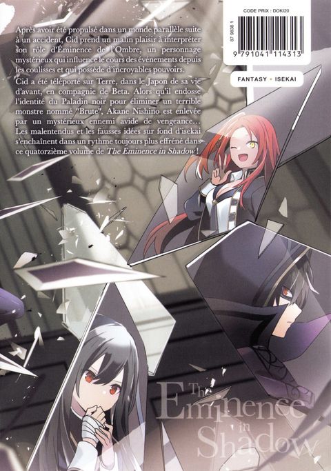 <div>Il est prêt à tout pour devenir une Éminence de l'ombre... mais ses plus gros mensonges vont le rattraper !</div><div>Après avoir été propulsé dans un monde parallèle suite à un accident, Cid prend un malin plaisir à interpréter son rôle d'Éminence de l'Ombre, un personnage mystérieux qui influence le cours des événements depuis les coulisses et qui possède d'incroyables pouvoirs.</div><div>Cid a été téléporté sur Terre, dans le Japon de sa vie d'avant, en compagnie de Beta. Alors qu'il endosse l'identité du Paladin noir pour éliminer un terrible monstre nommé "Brute", Akane Nishino est enlevée par un mystérieux ennemi avide de vengeance... Les malentendus et les fausses idées sur fond d'isekai s'enchaînent dans un rythme toujours plus effréné dans ce quatorzième volume de TheEminence in Shadow !</div>