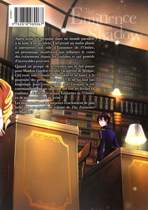 <div>Il est prêt à tout pour devenir une Éminence de l’ombre… mais ses plus gros mensonges vont le rattraper !</div><div>Après avoir été propulsé dans un monde parallèle à la suite d'un accident, Cid prend un malin plaisir à interpréter son rôle d’Éminence de l’Ombre, un personnage mystérieux qui influence le cours des événements depuis les coulisses et qui possède d’incroyables pouvoirs.</div><div>Quand un groupe de terroristes qui se fait passer pour Shadow Garden envahit l’académie de Midgar, Cid revêt son costume de Shadow et se lance à la poursuite des preneurs d’otages ! Il ne lui faut pas longtemps pour comprendre que l’attaque a été commanditée par un individu qui tire les ficelles en coulisses… La seule et unique Éminence de l’Ombre va de nouveau entrer en scène !</div><div>Les malentendus et les méprises s’enchaînent de plus belle dans ce quatrième volume de <em>The Eminence in Shadow</em> !</div>